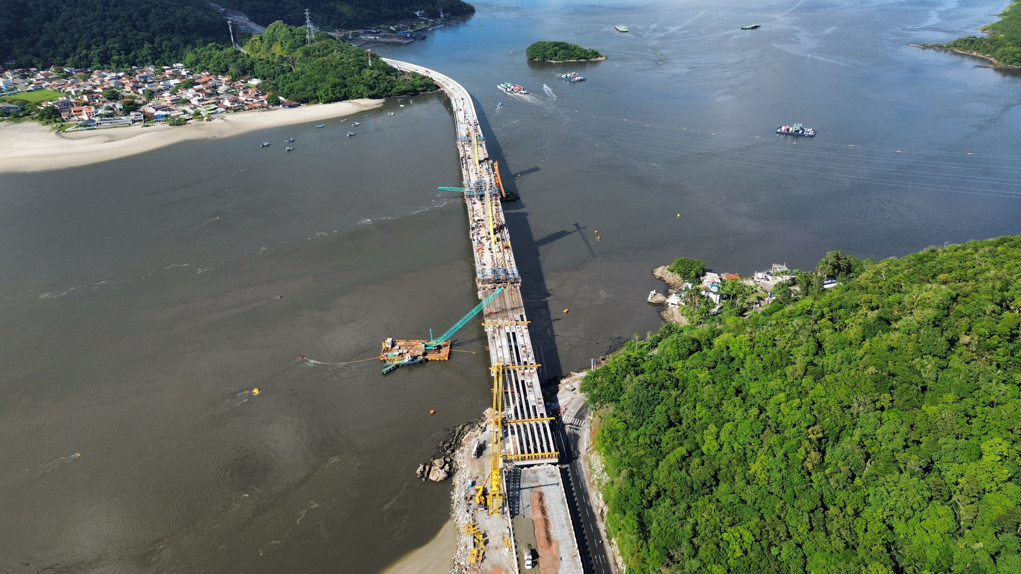 Também foi finalizado o lançamento das 160 vigas longarinas no trecho pré-moldado. Agora a obra entra em fase de conclusão do tabuleiro e dos acabamentos finais, como pavimentação e ciclovia. Os trabalhos concentram-se agora nos últimos quatro vãos do tabuleiro, com o lançamento de pré-lajes, armação e concretagem.