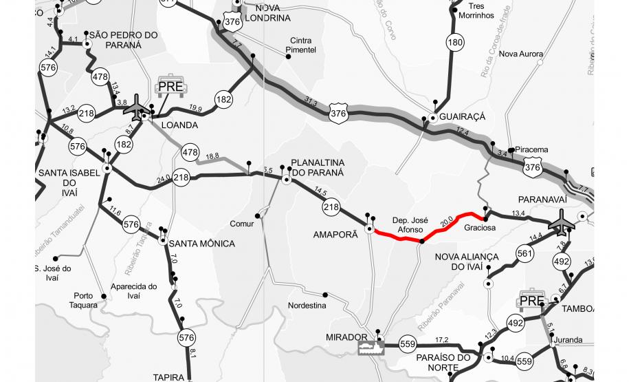 Começaram no início deste mês as melhorias em um novo trecho da PR-218, na região Noroeste do Estado. Desta vez os trabalhos estão nos 20 quilômetros entre o município de Amaporã e Graciosa, passando por Deputado José Afonso, distritos de Paranavaí, e beneficiam mais de nove mil habitantes.