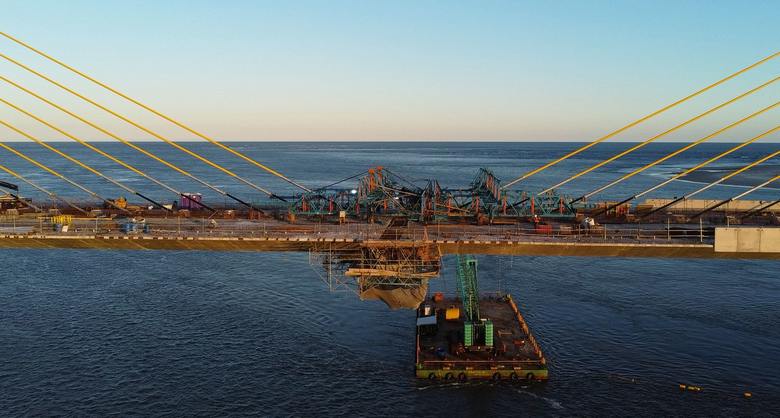 Antes da concretagem, realizada a partir de betoneiras nas balsas de apoio, uma treliça metálica de travamento foi instalada entre os dois lados da estrutura. Ela funciona como um sistema provisório de rigidez, mantendo as extremidades da ponte alinhadas enquanto o concreto era lançado.