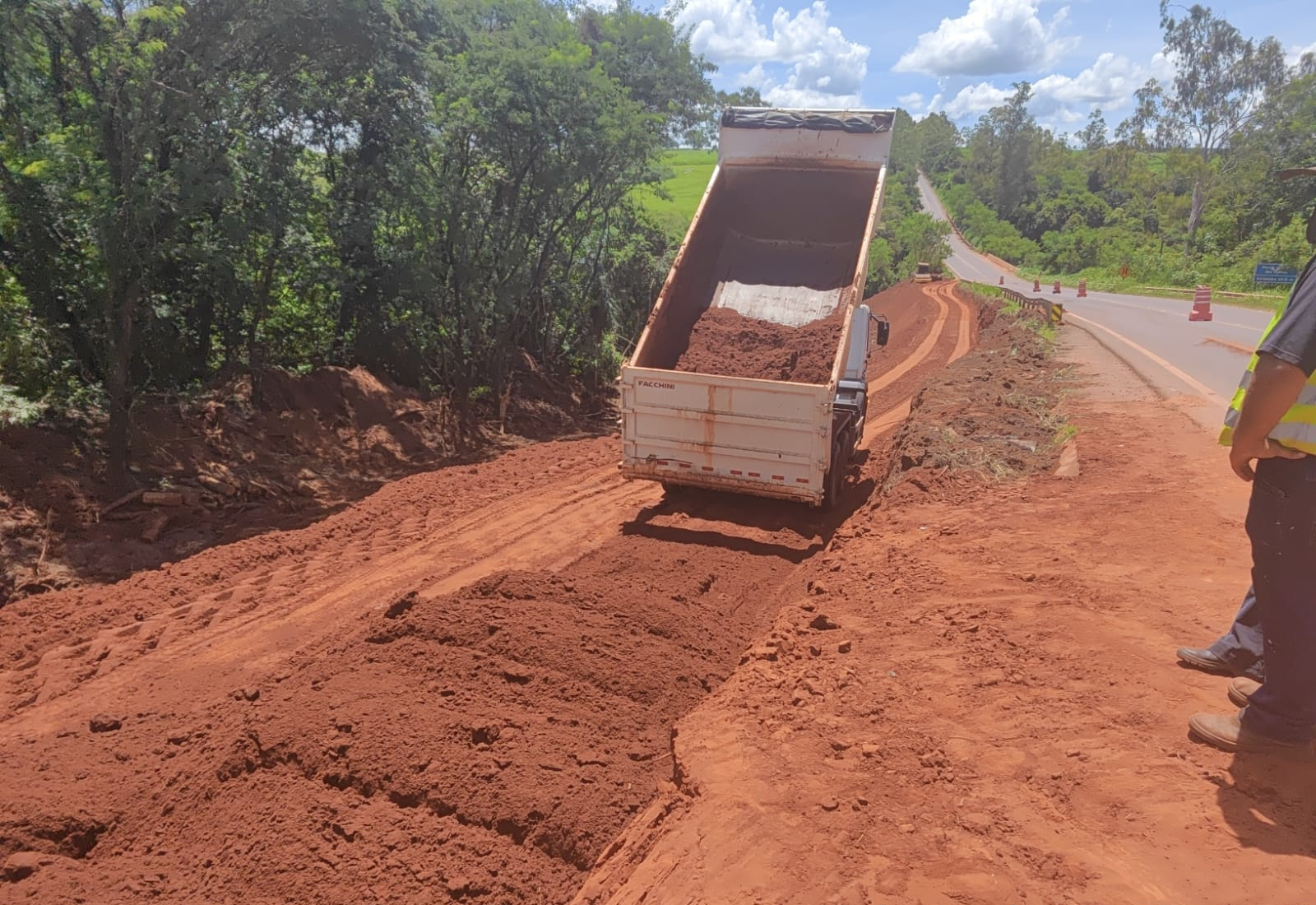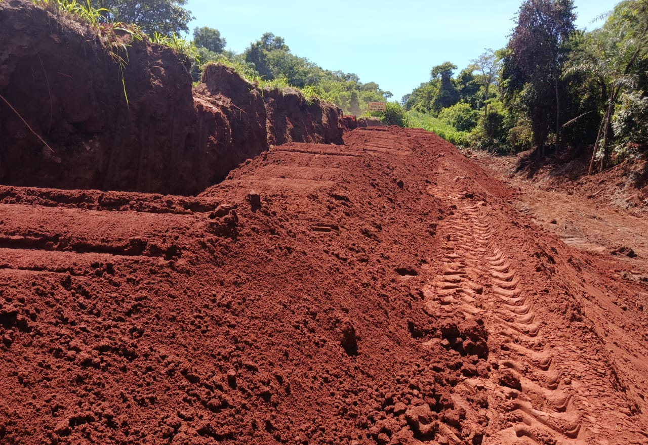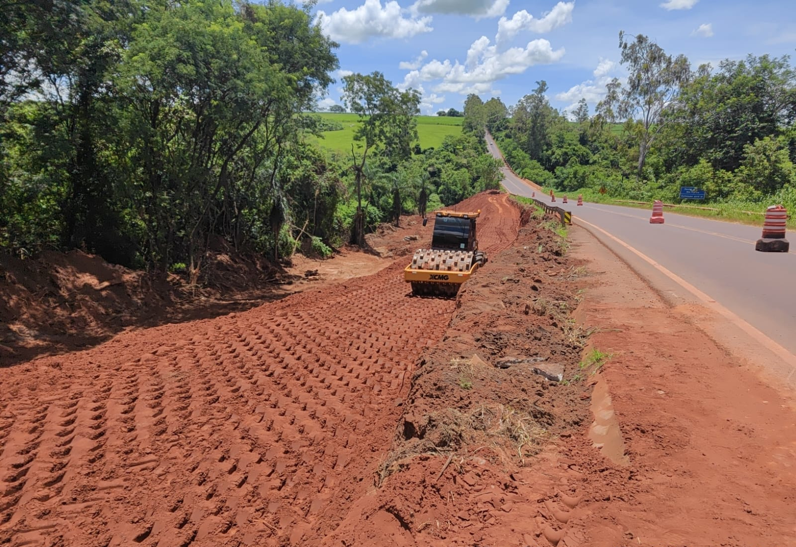 Já foram realizados os serviços de limpeza de camada vegetal, remoção do solo afetado, lançamento de solo novo e agora a compactação do aterro, já estabilizando o local e prevenindo futuros danos na pista.