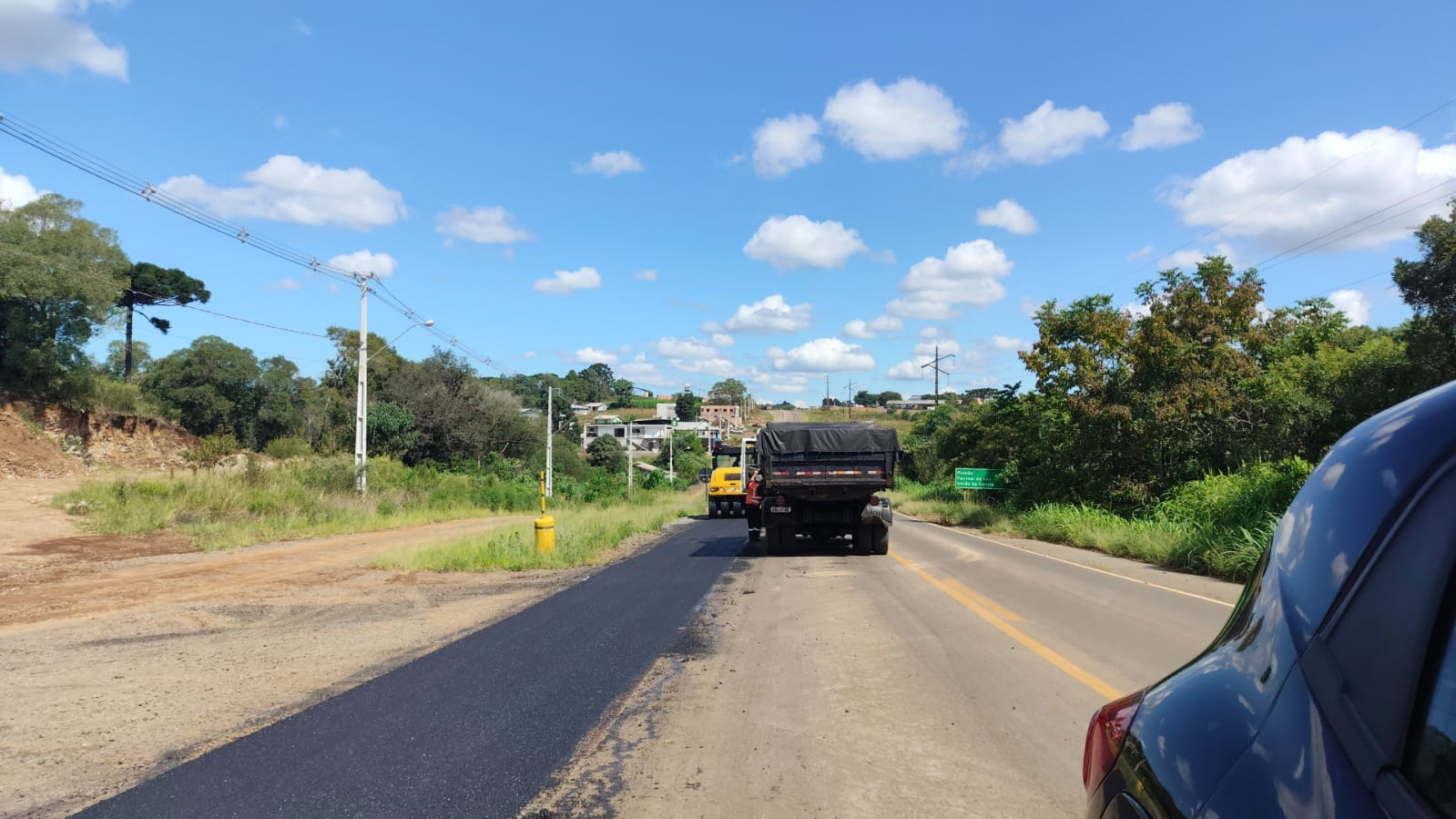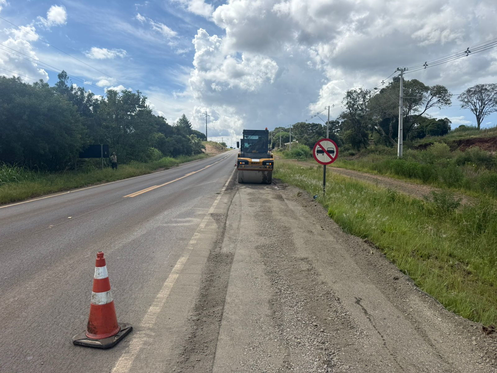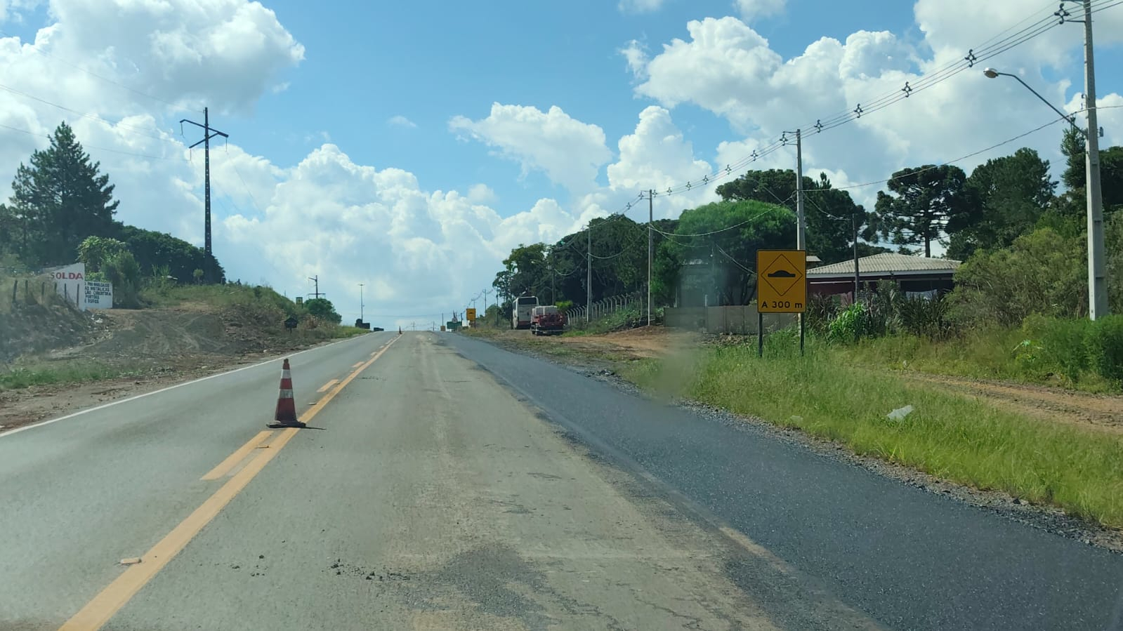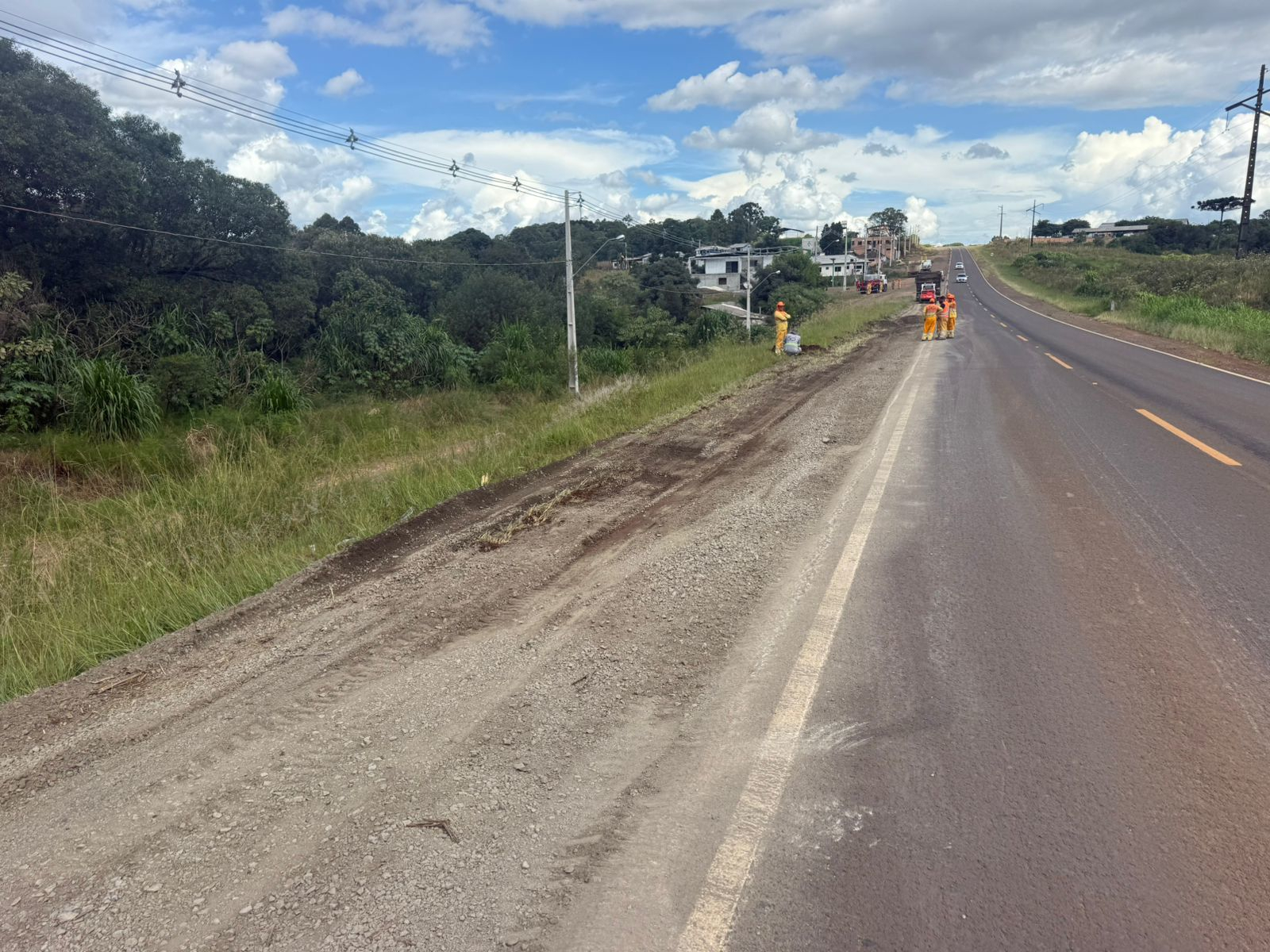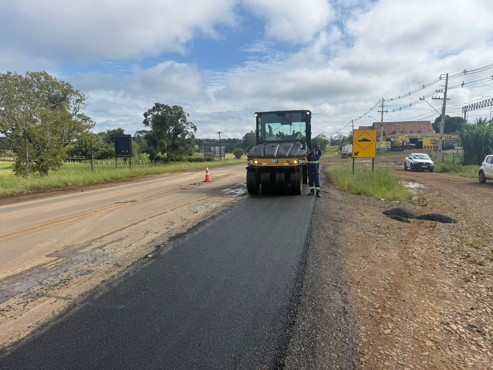 Está sendo executada uma nova camada de brita graduada simples de 13 centímetros e uma camada asfáltica de binder de 3,5 centímetros. As melhorias já eliminam o degrau com a pista e garantem mais segurança para todos os usuários da rodovia e moradores locais.