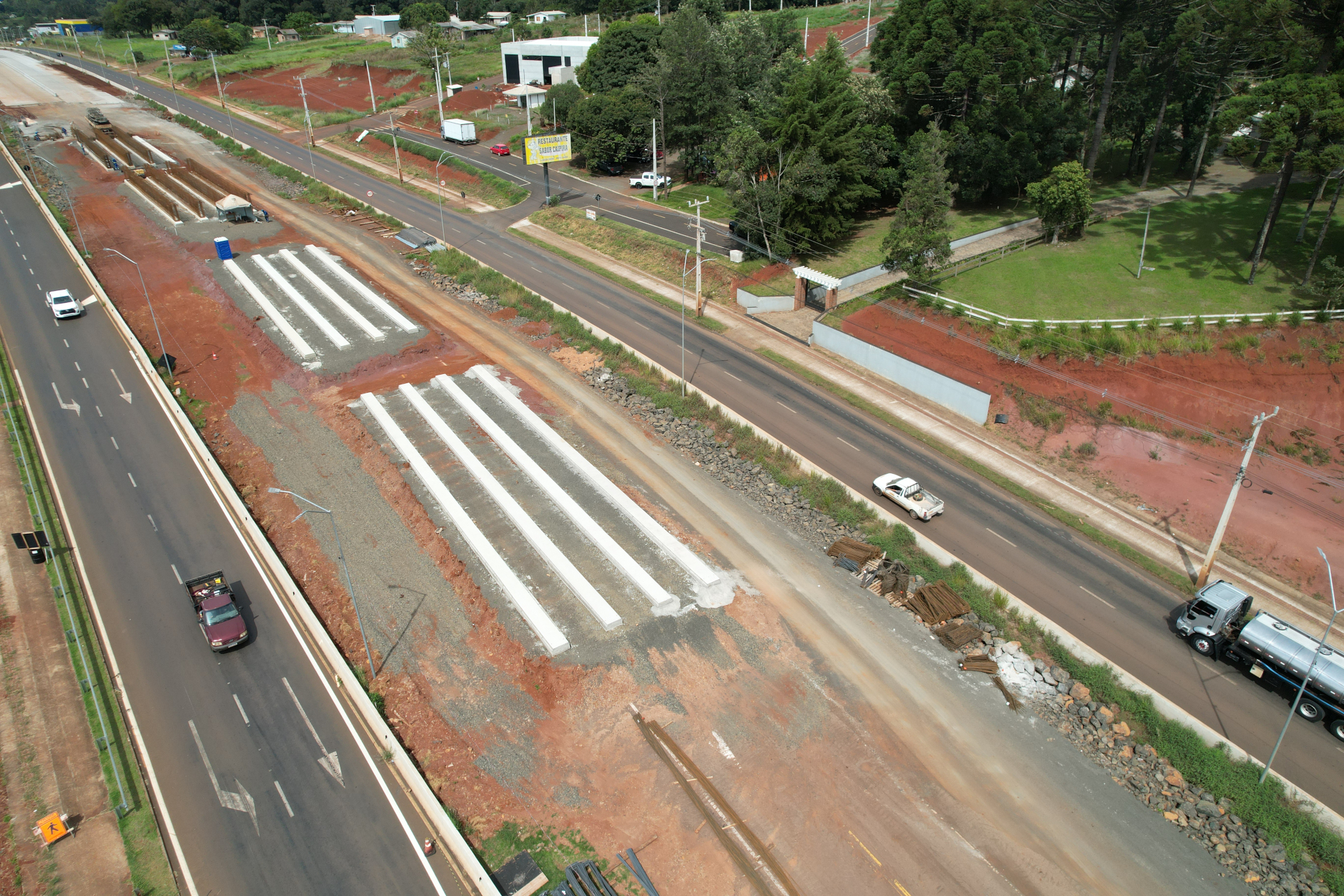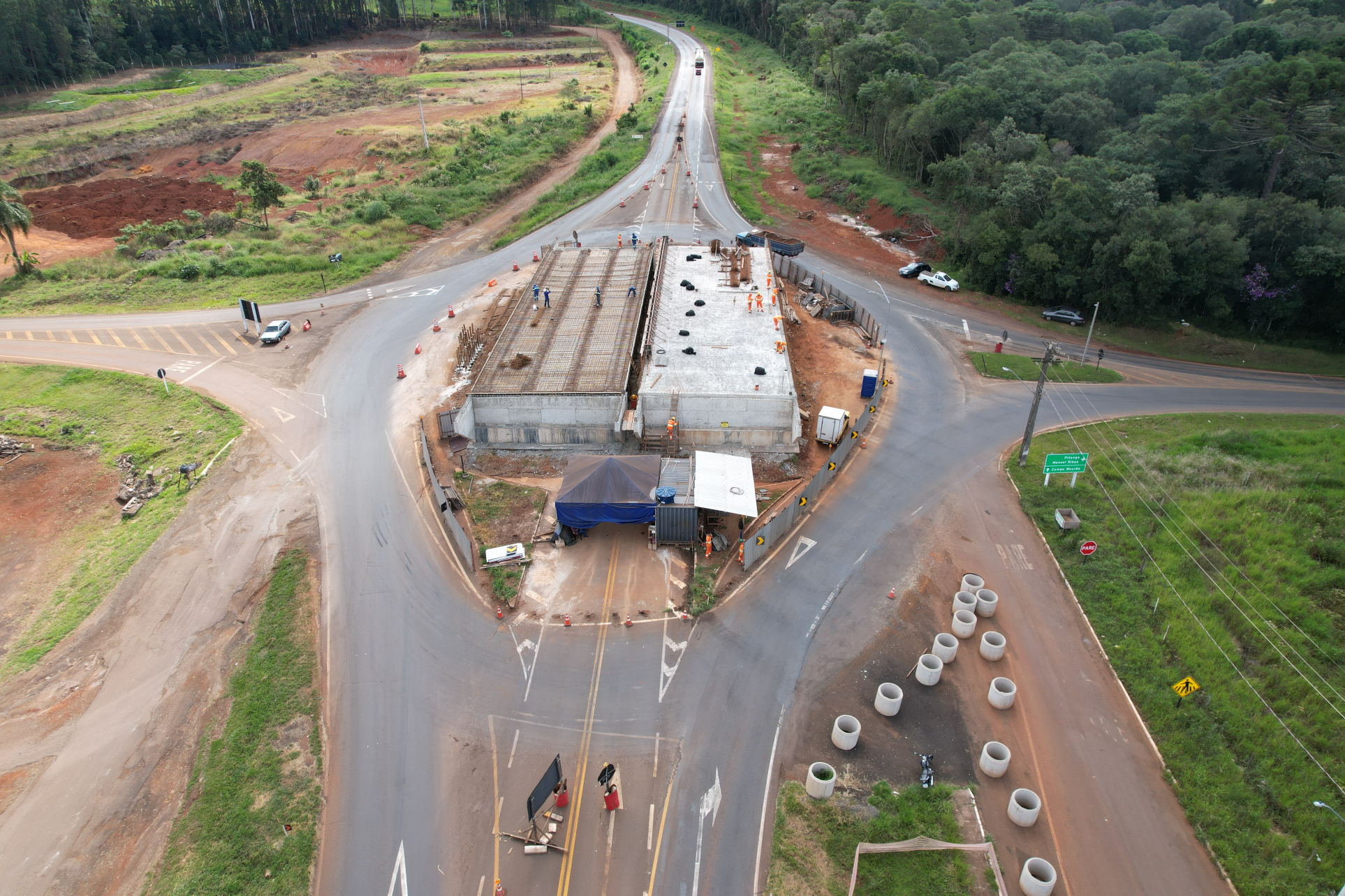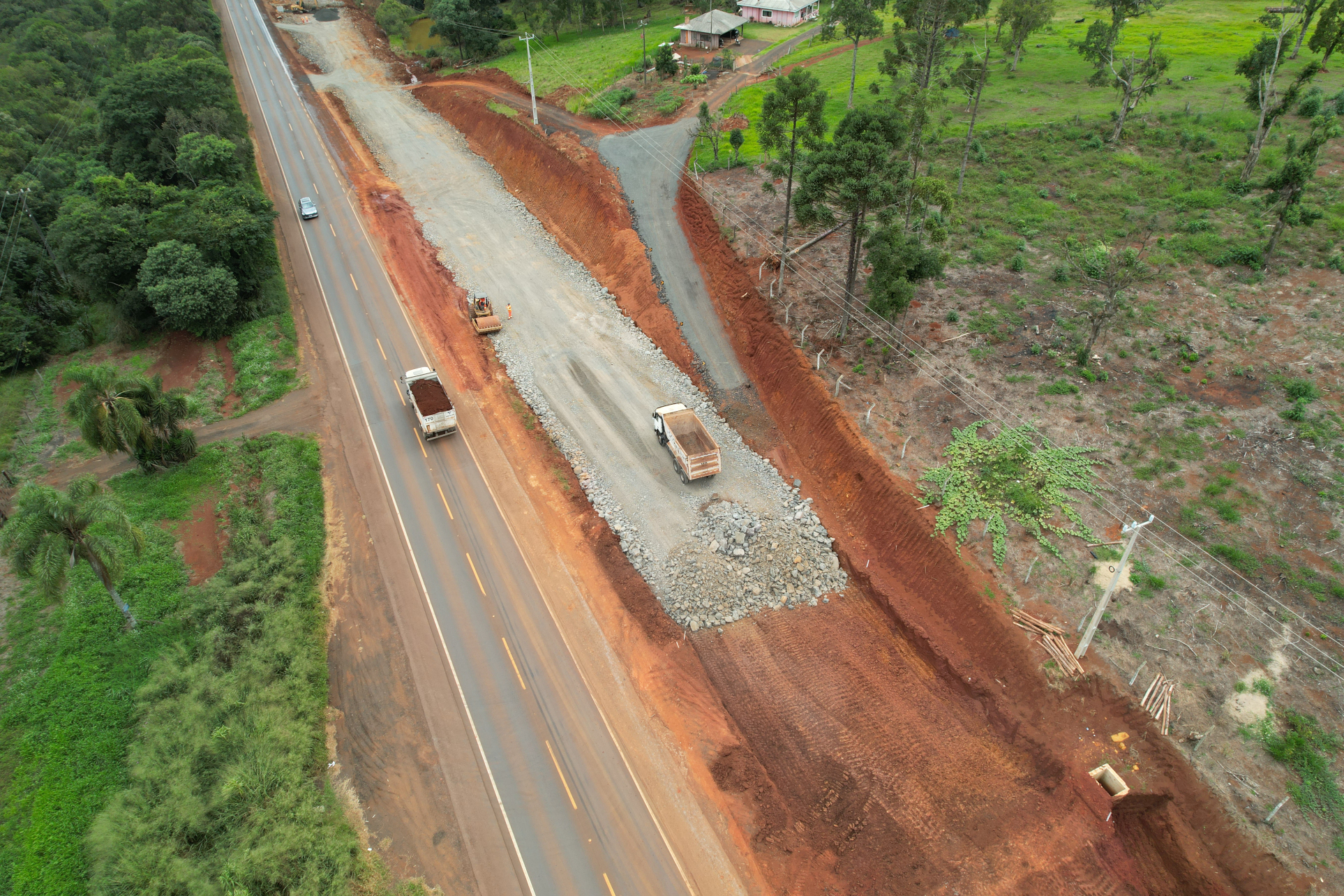 A implantação da nova pista em pavimento rígido de concreto continua avançando em ritmo acelerado, enquanto são realizadas melhorias no pavimento asfáltico da pista existente, que será aproveitada como base para uma camada de pavimento de concreto. Esta técnica de restauração é conhecida como whitetopping, e tem sido empregada com sucesso pelo DER/PR em rodovias de todo o Paraná.