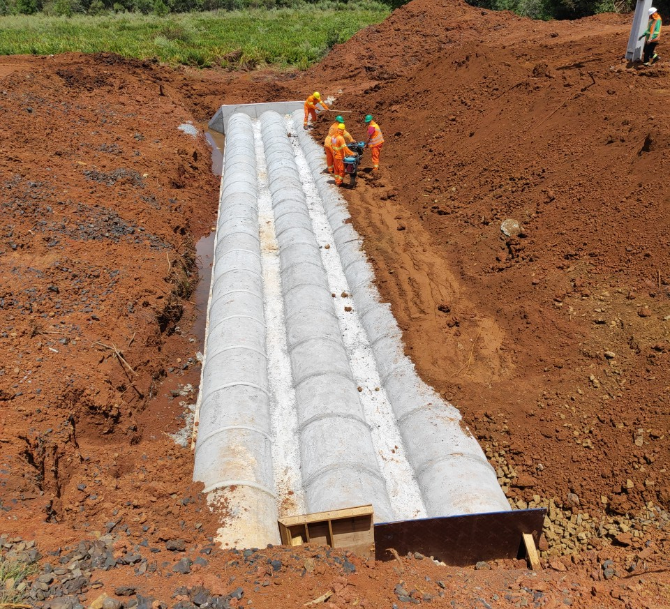 Também continuam avançando os serviços de terraplenagem da nova pista, incluindo operações de detonação de rochas, a implantação do sistema de drenagem de águas e construção de uma galeria celular em concreto.