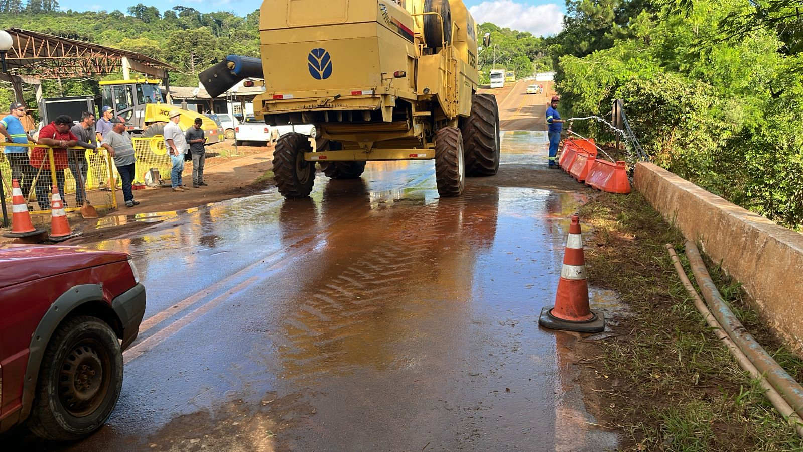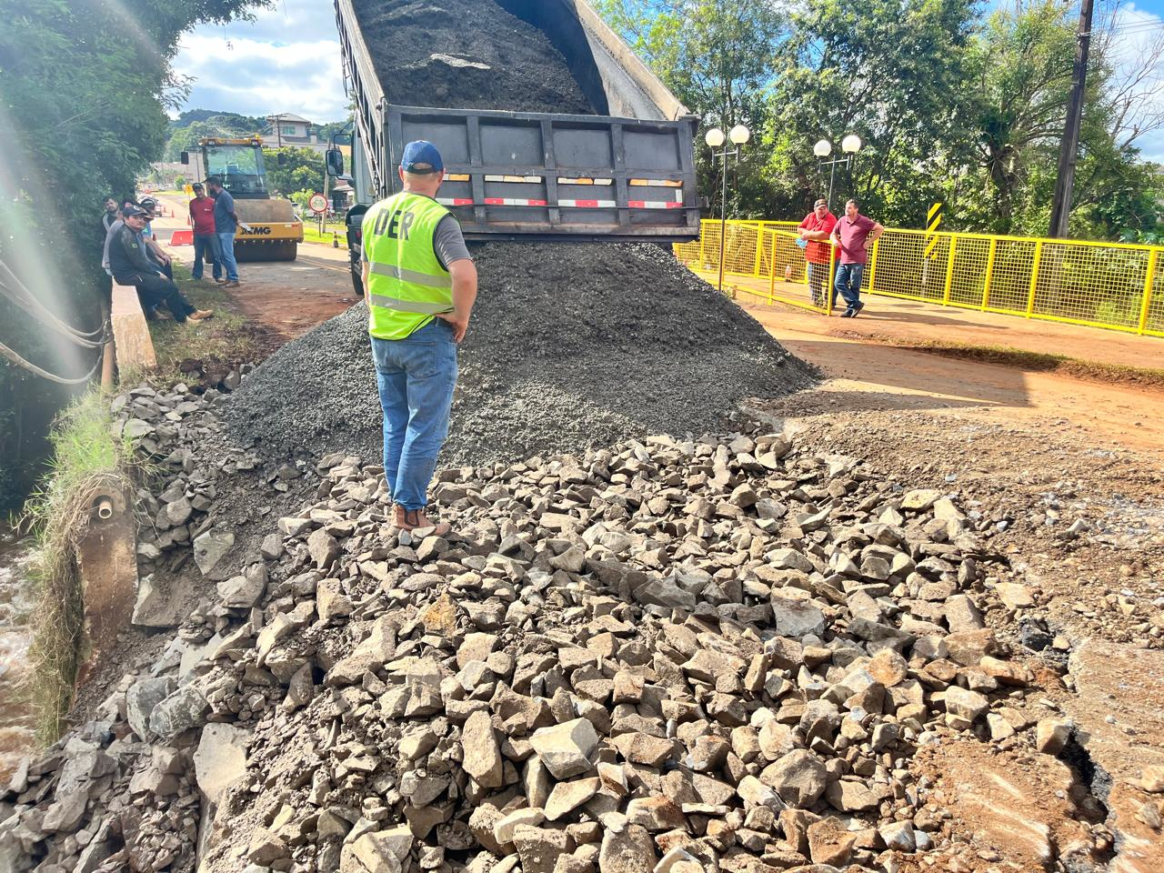 Por meio da equipe de administração direta do Escritório Regional Centro Oeste da Superintendência Regional Campos Gerais do DER/PR e da equipe do município, a erosão na cabeceira da ponte recebeu material rochoso para garantir estabilidade, e depois foi realizada recomposição de talude e pista com material fresado. Também foi realizada a limpeza do pavimento e disponibilizada sinalização provisória no local.