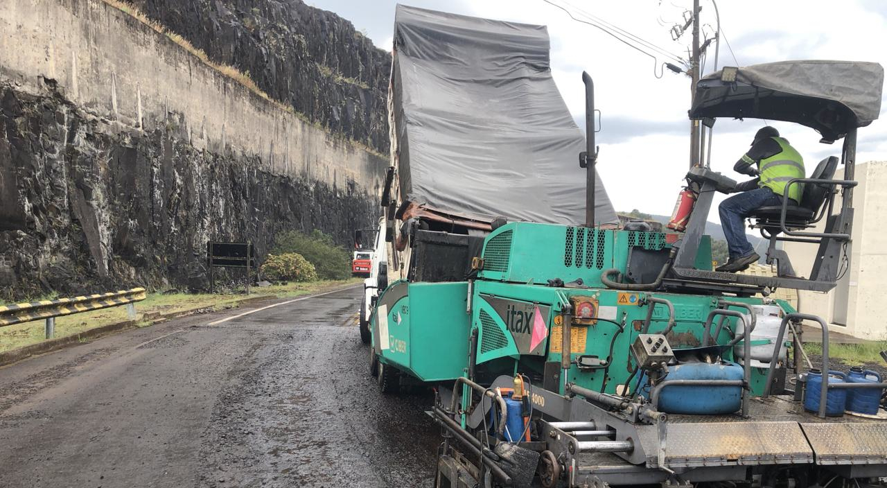 Está em andamento a fresagem do pavimento antigo, em que uma camada superficial (capa) é removida por maquinário pesado, seguida pela reperfilagem, que é a aplicação e compactação de uma nova camada de concreto asfáltico usinado a quente (CAUQ), garantindo uma pista mais segura e sem defeitos.