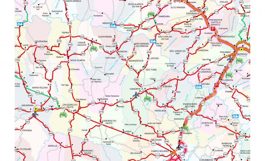 Para Umuarama: sair de Maringá pela PR-317 e continuar pela PRC-158 até Campo Mourão, seguir pela BR-487 até Cruzeiro do Oeste, retornando à PR-323 até Umuarama.