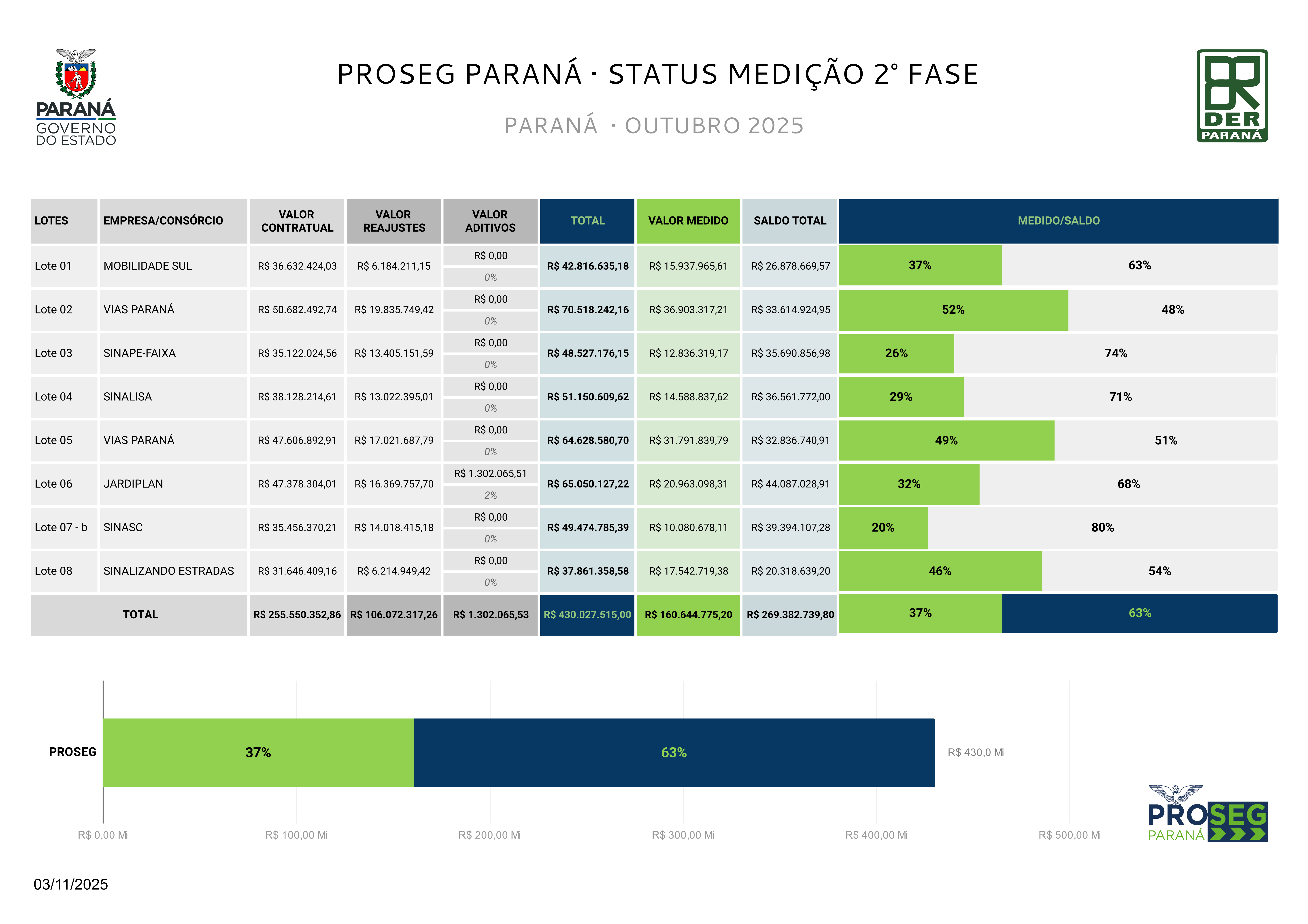 Através de um processo licitatório, cada lote teve uma empresa vencedora para realizar os serviços propostos no PROSEG, que seguem listadas a seguir, assim como, valores totais por contrato, da medição e saldo respectivamente.